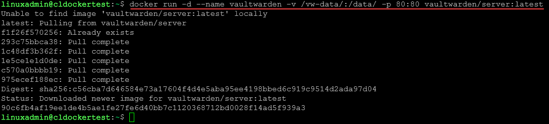 Pull the Vaultwarden Docker image from the upstream repository using the sudo docker command: sudo docker pull vaultwarden/server:latest. You can also deploy Vaultwarden using Docker Compose.