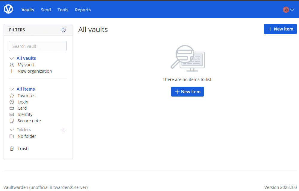 After logging in with the new account, you will arrive at your Vaultwarden dashboard where you can start storing passwords.
