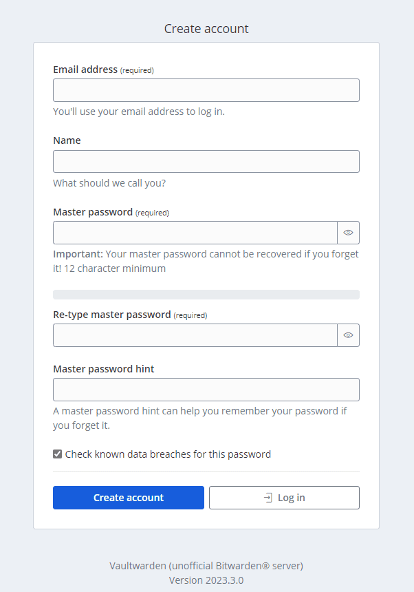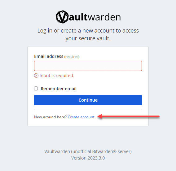 Once you have stood up the Docker container installation, you can browse to the IP of the host the container listens on. You will see the Vaultwarden Server login screen. Click the Create account link.