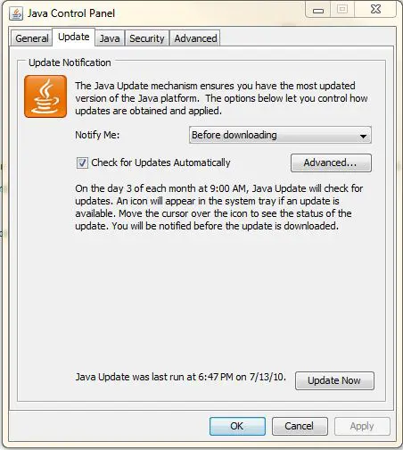 It seems no matter how up to date a workstation is, due to the highly vulnerable nature of computers –ย security updates, patches, updates and other software downloads are constantly checking to see whether or not you have the latest version of software.ย One of these that can be a pain especially for system administrators who prepare workstations for under privileged users who may not have permissions to install software.ย Fortunately, with Java, there is a Java control panel that can be used to configure whether or not Java downloads updates and how often.ย This is located under control panel as Java (32 bit)