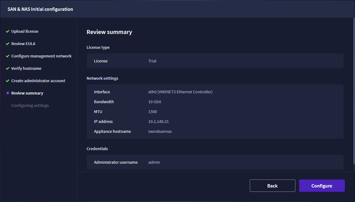 Once you browse to the web interface for the first time, you will run through an initial setup wizard that will have you set up an admin user, basic networking, etc. One of the enhancements I like with this release compared to previous releases is you can configure an admin user. Before, the admin user was called user, which was a bit non-intuitive. Also, you couldn’t change this during the setup.
