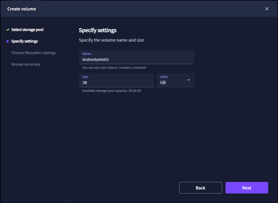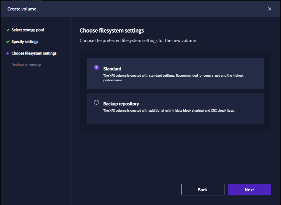 You can define the purpose of the new volume. The choices are Standard and Backup repository.