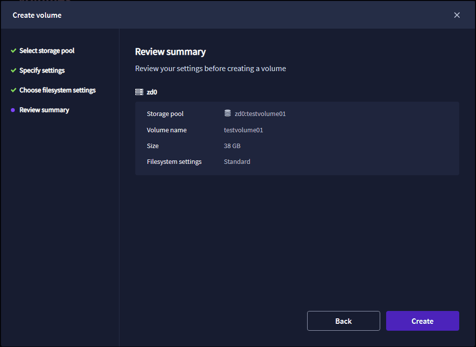 Review the summary of configuration options when creating a new volume.