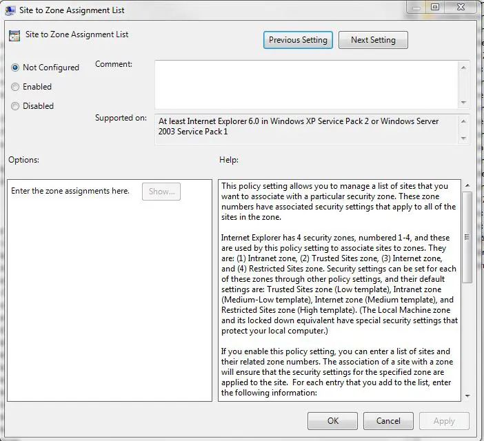 This policy setting allows you to manage a list of sites that you want to associate with a particular security zone. These zone numbers have associated security settings that apply to all of the sites in the zone.Internet Explorer has 4 security zones, numbered 1-4, and these are used by this policy setting to associate sites to zones. They are: (1) Intranet zone, (2) Trusted Sites zone, (3) Internet zone, and (4) Restricted Sites zone. Security settings can be set for each of these zones through other policy settings, and their default settings are: Trusted Sites zone (Low template), Intranet zone (Medium-Low template), Internet zone (Medium template), and Restricted Sites zone (High template). (The Local Machine zone and its locked down equivalent have special security settings that protect your local computer.)If you enable this policy setting, you can enter a list of sites and their related zone numbers. The association of a site with a zone will ensure that the security settings for the specified zone are applied to the site. For each entry that you add to the list, enter the following information:
