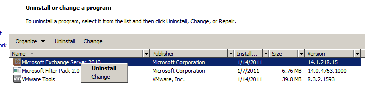 The process to remove roles from Exchange 2010 is fairly straightforward. In order to remove a role or all roles from an Exchange 2010 server, you initiate the process from “Programs and Features.