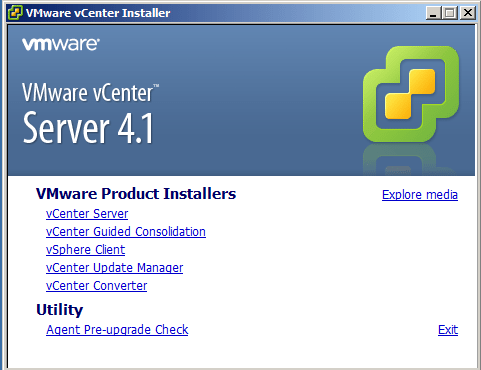 Once you run the DVD, you will be presented with the following installation screen for vCenter Server 4.1.ย Notice that you have the options for many other components here, however, for this post, we will focus on the vCenter Server install: