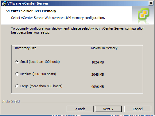 ย vCenter Server JVM Memory configuration screen allows you to configure your deployment Memory: