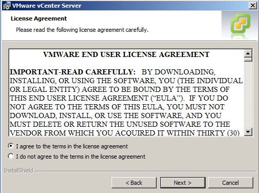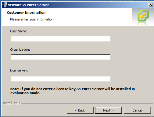 Enter your Customer Information including “User Name” “Organization” and also very importantly your “License Key.”ย As noted for the license key field, if you do not enter one, vCenter will be installed in Evaluation Mode.
