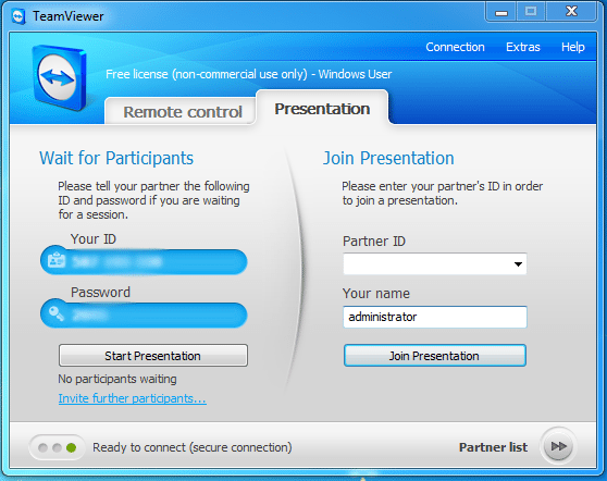 The concept to connect to someone remotely is pretty simply.ย You simply “run” TeamViewer on your administrator workstation that you want to connect “from” and enter the “Your ID” value that the client machine generates, and also the “Password” that is generated on the client machine.ย Once both of those are entered, you are able to connect to the client machine.