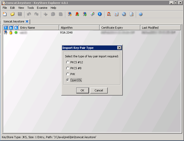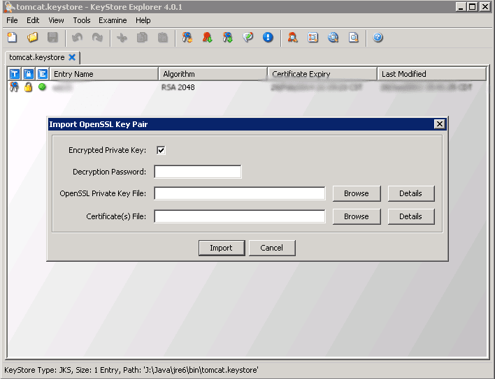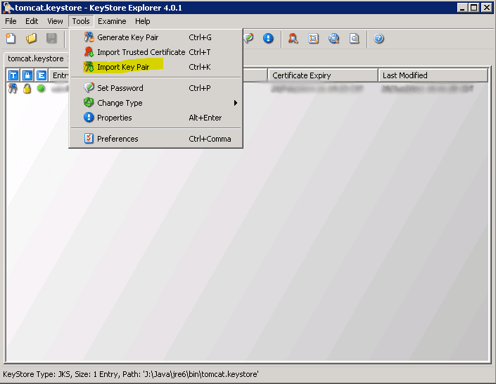 Since we were running Tomcat on a Windows box, we downloaded a very handy free program below calledย โKeystore Explorer.”ย This program provides a GUI interface to keystore management in Tomcat.
