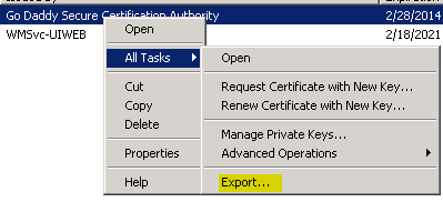 We then want to right click the certificate that we want to export which is the Godaddy Secure Certificate, choose “All Tasks” and then “Export.”