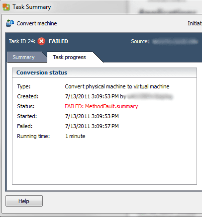 In a client production environment a few days ago we ran into an error importing a physical server into a virtual environment.ย The server being imported was a Windows Server 2008 R2 box.ย The error message that we received in our vSphere client was “FAILED: MethodFault.summary.”ย A screenshot of the error taken from the Task Progress tab of Tasks and Events is shown below: