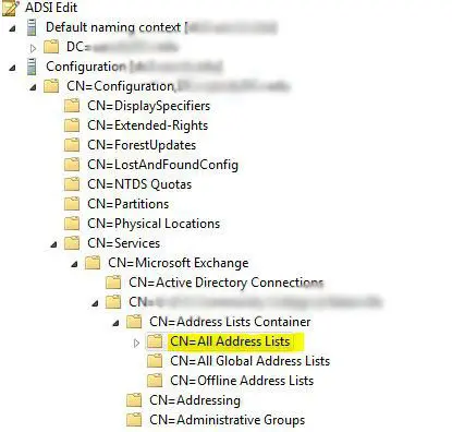 Open ADSIEDIT and navigate to your “Configuration” container, “Services, Microsoft Exchange, Address Lists Container, All Address Lists”ย Here you will see a listing of all your address lists available to exchange.