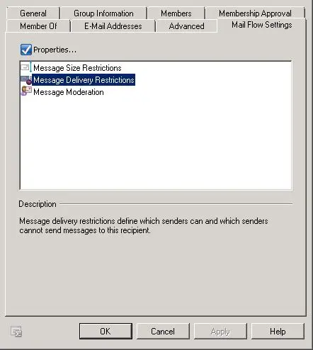 - Right-click the Distribution group you want to restrict and alter the settings of either the “Only Senders in the following List” or the “Reject Messages From” list.