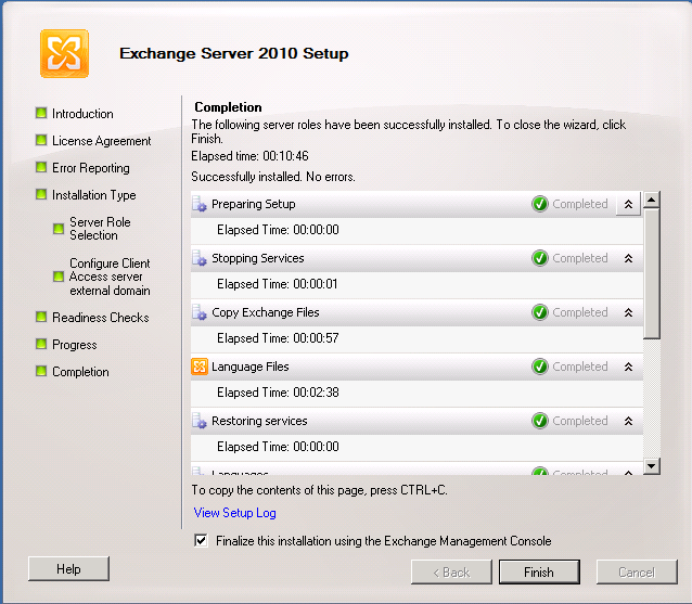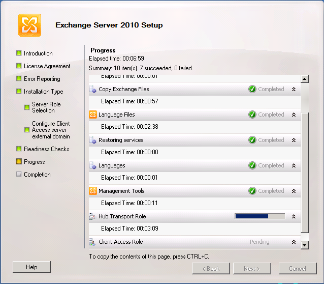 Installing the Hub Transport role and an additional CAS role is extremely painless.ย We simply mounted the media and selected our roles and continued to Install the product.