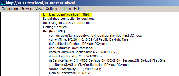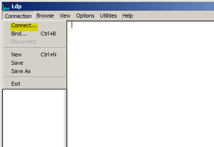 There is a really powerful tool to check a variety of things built into Windows 2008 servers with Domain Services role installed. It is the LDP.exe utility. You can simply launch this from a run menu. While this utility can do a wide variety of things for us, we will simply use it to check connection information to Active Directory via our configured ports.