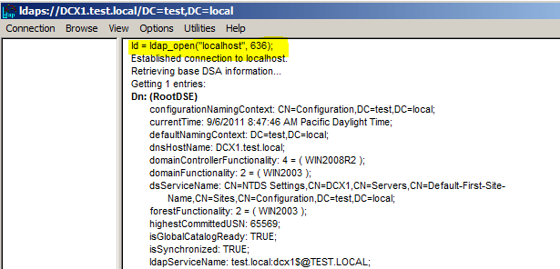 The default port is port 389 for LDAP connections and this is enabled by default. However, for security and functionality reasons, we want to enable port 636 for a secure connection. Note the results of connecting via 389 and 636 on our test server.