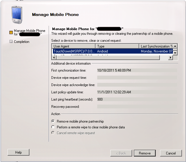 In the console you can see the agent that has connected to the EAS service.ย You can choose to “Remove mobile phone partnership” or “Perform a remote wipe to clear mobile phone data”.