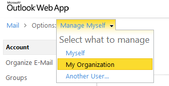 After logging into Outlook Web Access as an Exchange Administrator, you can “Manage the Organization” from within the Outlook Web Access Options.ย This menu can be found on the right hand side by pulling down the menu underneath the username…..click See All Options