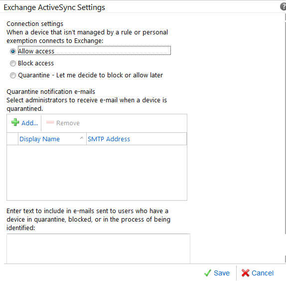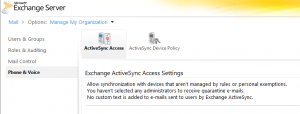 Default Exchange ActiveSync Settings – defining what you want the default behavior to be when a device attempts to connect via EAS.ย This can also be done via the EMS