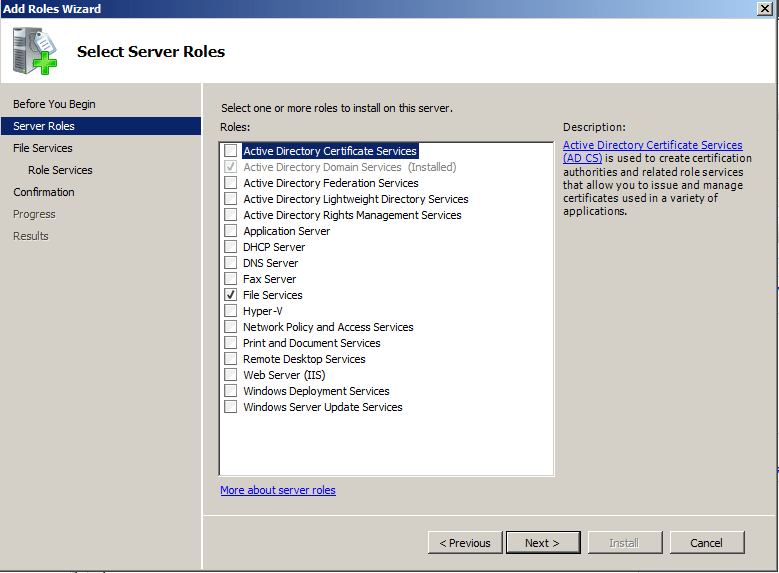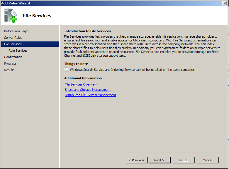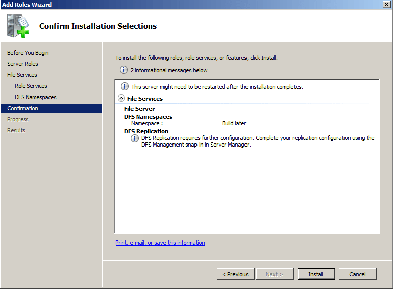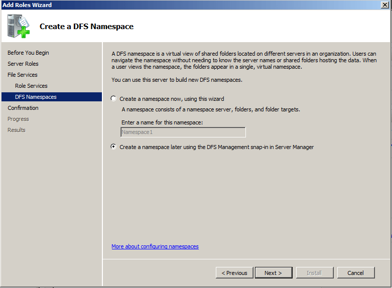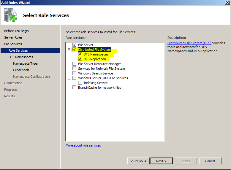Distributed file system allows for highly available access to files and folders through a type of replication that is Wide Area Network friendly. This feature is ideal for administrators that want to have highly available shared folders accessible through a common namespace and allow these to synchronize between the servers hosting the namespace. Take a look below at the screenshots of the installation process on a Windows Server 2008 R2 server.