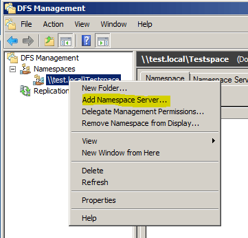 Below we can right click on the Namespace we create and add Namespace Server to the namespace which is part of the initial configuration of DFS