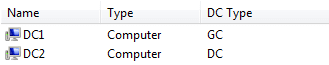 Many may not realize you can actually see which domain controllers are global catalogs from Active Directory Users and Computers. Simply find your Domain Controllers OU and look at the DC Type column. “Normal” or non-GC domain controllers will simply have the designation DC while the global catalog servers will have the designation GC.
