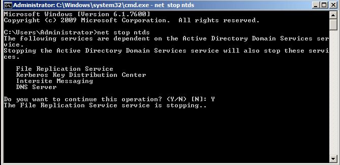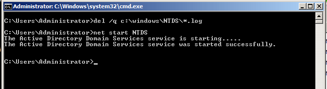 After you have finished copying the compacted file to the proper location, and deleted the log files, you can then restart the ADDS service or restart your pre Windows 2008 domain controller normally.