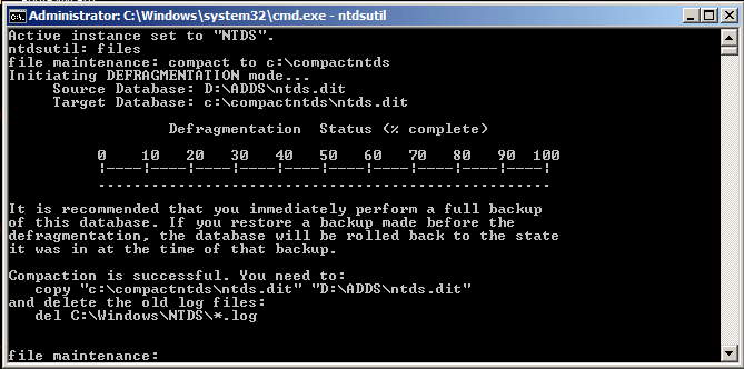 The compacting process for an Active Directory database is pretty straightforward.ย Keep in mind that you will need to do this on all domain controllers that need to be compacted as the physical database itself isn’t replicated to all other domain controllers.