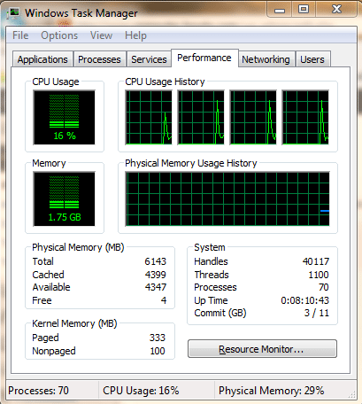 In fact, in Windows 7, Resource Monitor is actually available from the task manager “Performance” tab which makes it easy to being troubleshooting from Task Manager and then move on to Resource Monitor if the need be.ย However, if you want to get to the application directly, simply type resmon at a run/search menu.