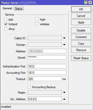 - Also, you can setup RADIUS authentication on the hotspot properties if you have a RADIUS server that authenticates users on your network. ย To do this you first need to setup the RADIUS server parameters for your network under the parent RADIUS menu in Winbox. ย Then under your hotspot properties (IP >> Hotspot >> Server Profiles) click on your hotspot that you configured and then the RADIUS tab to enable the “use RADIUS” option.