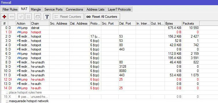 - Firewall rules can be found at IP >> Firewall. ย You will see the default hotspot rules that get added after the hotspot setup is complete, however, you can add any additional rules that you may need in your network.