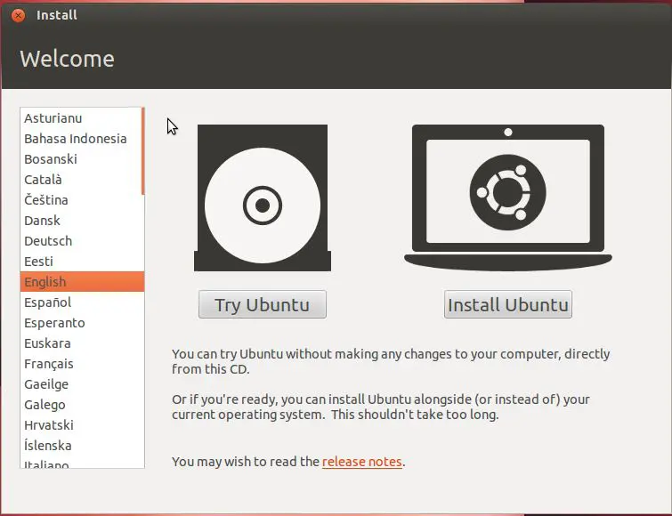 Setup asks you what you want to do – “Try Ubuntu” or “Install Ubuntu”