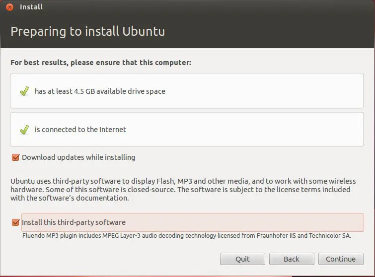 After selecting your install method, you will see a prerequisites check performed and the option to select to download updates as well as install some third party plugins during the installation process itself.