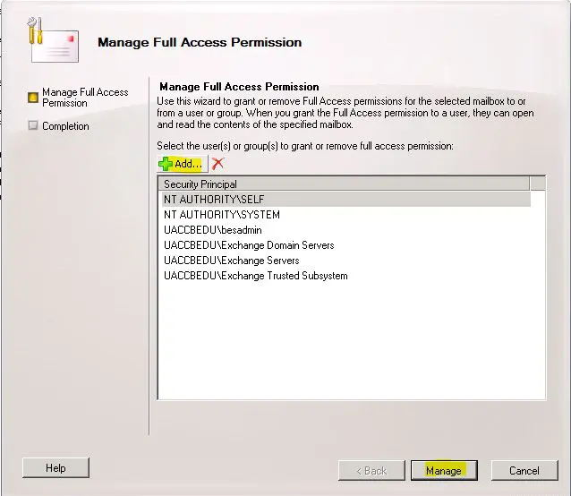 If you need for a user to be able to open someone else’s mailbox and have full access permissions to see everything, send as that user, etc, Exchange 2010 makes this easy with the “Manage Full Access Permission” wizard in the Exchange Management Console (EMC) or by using powershell in the Exchange Management Shell (EMS). Â Simply click on a user whose mailbox you would like to grant permissions “to” and you will see the Manage Full Access Permission option. Â Click on this and you will see the wizard pop up.