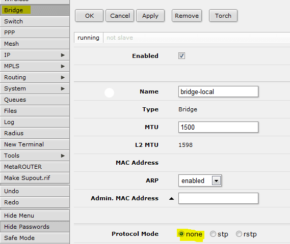 - Bridge >> Protocol Settings >> change to NONE