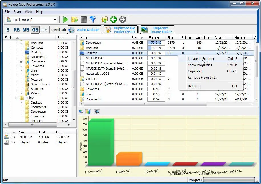 There is a really great free utility made by MindGems Innovative Software Products called Folder Size that provides a really nice graphical explorer type interface that graphically scans and displays folder sizes in a hierarchical listing. After the scan completes, the program even shows the information in various graph formats including bar graph, pie graph, and animated graph formats. There are also handy contextual menus that can be used to right click on a folder or file, and quickly locate that file in Windows Explorer outside of the program.