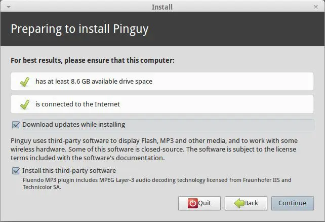 - Here we have a self test of sorts that shows whether or not your computer meets minimum disk space specs and has Internet connectivity. You also have the ability to download some “extras” as well as download updates while installing