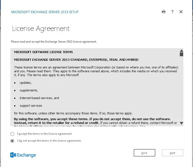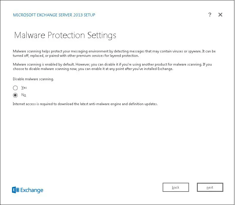 New to Exchange 2013, there is “in-the-box” malware protection. ย The installer asks if you want to leave this turned on (default) or turn this feature off.