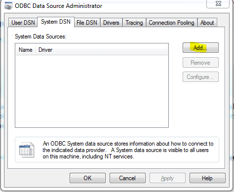 If you are configuring ODBC on a 64-bit workstation, you will need to launch the ODBC utility by executingย c:\windows\syswow64\odbcad32.exe
