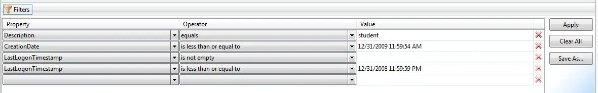 A client that I have worked with was looking to find student accounts that were older than a year old and had certain other attributes. Using the script above we were able to pull a list of students that met a certain criteria. With Powergui, you can filter your results from a certain script based on just about any attribute that is related to a user. In the screenshot below, you will see that we setup a filter to look for accounts with a certain description, a creation date of a certain time period and prior, and criteria based on the lastlogontimestamp as well.