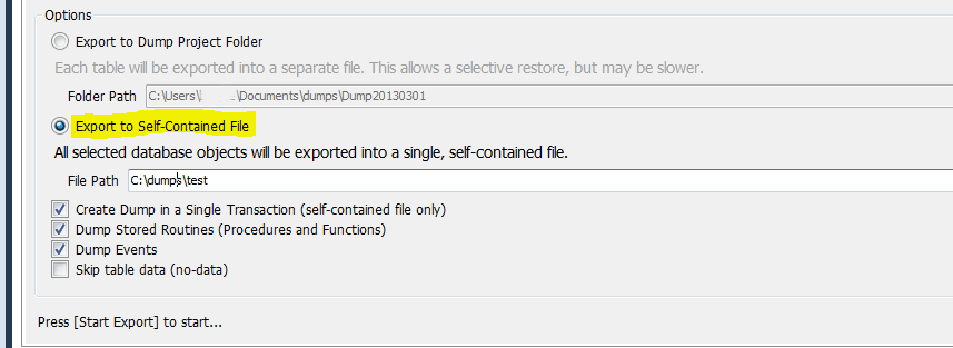 At the bottom of this screen, you will see the options available to backup your DB. ย We have chosen here to Export our DB to a “self-contained file” which makes things a little easier as you only have one restore file to work with. ย You can also choose to export the backup to a dump project folder which dumps each table to a separate file, allowing you a little more control over which things you want to restore. ย However, for our purposes, we know that we want to restore everything so we are selecting the self-contained file.