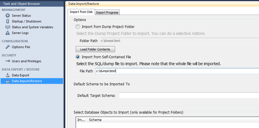 Our steps here are basically the reverse of what we did before. ย On the left hand side of the console under Data Export / Restoreย you will selectย Data Import/Restore this time. ย Also, you will notice that we are pointing the import to the folder/backup file we created in the backup process above.