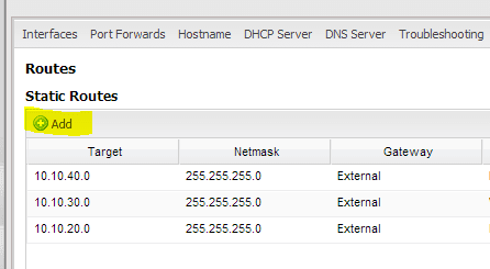 - Under Routes choose to Add a static route. Your Gateway may depend on how you have your box configured. For our particular environment we didn’t need to add the IP of the internal routers, rather we needed to tell Untangle which side the routers connect through.