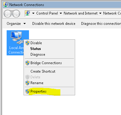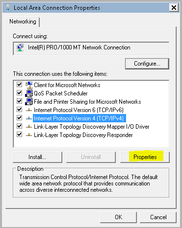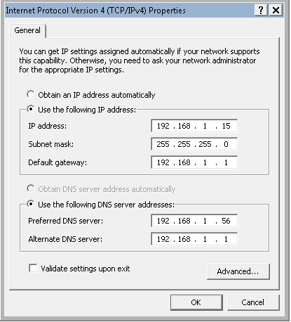 Below you will see the IP address settings of the test workstation for example purposes. ย You will see a statically assigned IP below and the DNS server setting values. ย If you are pulling a DHCP address, which is most likely the case, you will see theย Obtain an IP address automaticallyย set as well asย Obtain DNS server address automatically