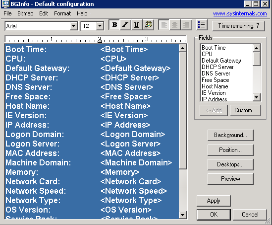 Take a look at the screenshot below of the configurable options and values that can be added to BGinfo information. ย You can also customize the background, colors, etc.