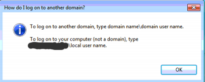 You may have run into a situation where you need to login locally to a workstation that may be joined to a domain. The last person that logged into the workstation used the domain credentials so by default, the workstation is displaying the log on to as the domain. You need to know the local computer name to force the computer to login to the local user account database instead of the Active Directory domain. You can click the hyperlink right below the login box: “How do I log in to another domain” and it will tell you your local computer name as well as direct you to use a local user name to login. The screen that pops up is displayed below.