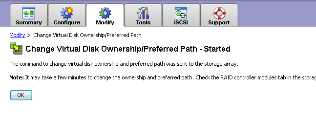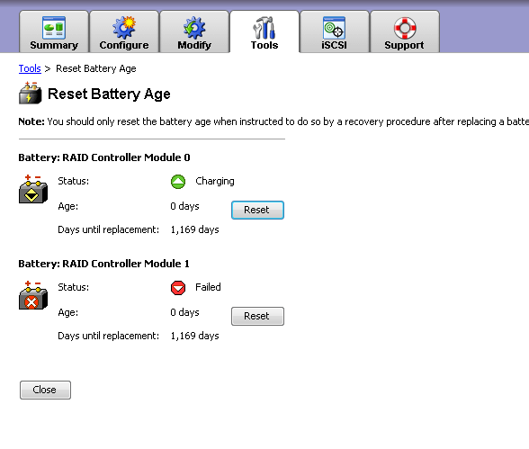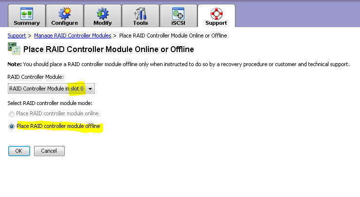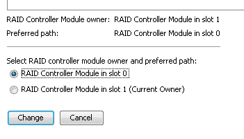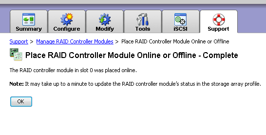 In order to change out the RAID controller battery, you need to make sure that both paths or both RAID controller modules are cabled correctly and are at least healthy enough (besides the battery) to switch traffic over to.ย Then we use the MDSM to take the problematic controller offline which will switch all processing of traffic to the other RAID controller by default.
