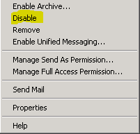 The process to change the resource account from one domain to another becomes pretty straightforward. You simply disable the user in EMC you want to remove the Exchange attributes from and then reconnect the mailbox to the new mirrored user you created earlier in the desired domain. Under the Recipient Configuration >> Mailbox you will be able to right click your Exchange 2010 user and disable which will remove all Exchange attributes from the account.