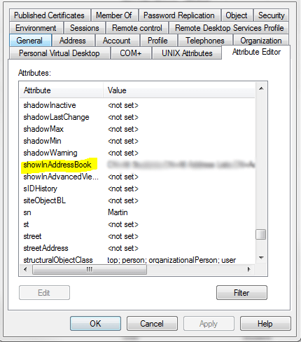 In working in a client’s environment with Exchange 2010 SP1 after a mostly successful migration from Exchange 2003, the client had issues with users who were showing up in particular address lists that they should not have been included in according to the Exchange server.ย When the client would preview their address list in the Exchange Management Console, the filtered users would show up correctly, however, when the address list was selected in Outlook, the users were not displaying correctly.ย A closer investigation of the individual users finally led us to discover the “showinAddressList” attribute was set incorrectly on the individual users showing where we did not want them to display.